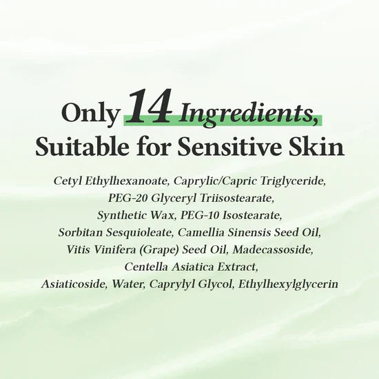 Cetyl Ethylhexanoate, Synthetic Wax, Caprylic/Capric Triglyceride, Sorbitan Sesquioleate, PEG-10 Isostearate, PEG-20 Glyceryl Triisostearate, Caprylyl Glycol, Ethylhexylglycerin, Camellia Sinensis Seed Oil, Vitis Vinifera (Grape) Seed Oil, Madecassoside, Centella Asiatica Extract, Asiaticoside, Water